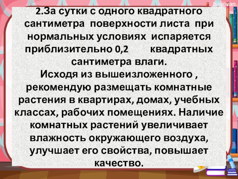 Таким образом воздух, окружающий растение, более влажный, чем воздух в тех помещениях, где растения отсутствуют.