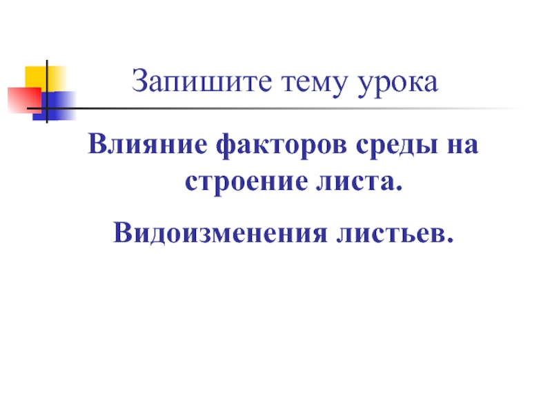 Запишите тему урокаВлияние факторов среды на строение листа.Видоизменения листьев.