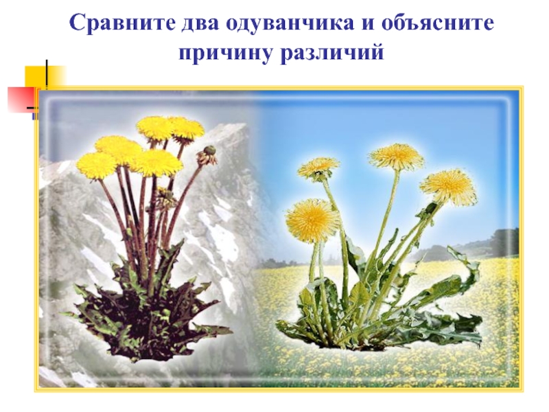 Слайд 1Сравните два одуванчика и объясните причину различий