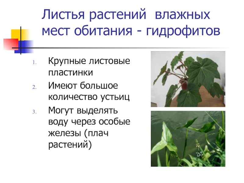Листья растений влажных мест обитания - гидрофитовКрупные листовые пластинкиИмеют большое количество устьицМогут выделять воду через особые железы