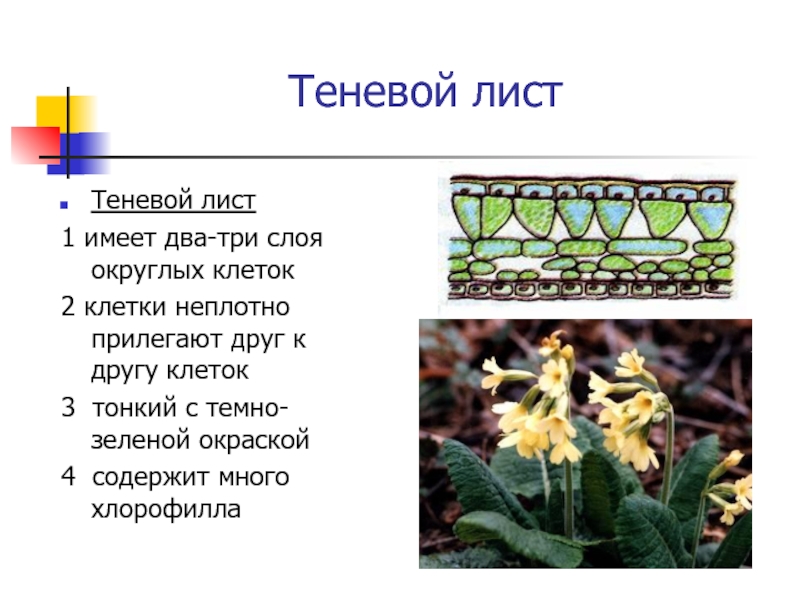 Теневой лист Теневой лист 1 имеет два-три слоя округлых клеток2 клетки неплотно прилегают друг к другу клеток