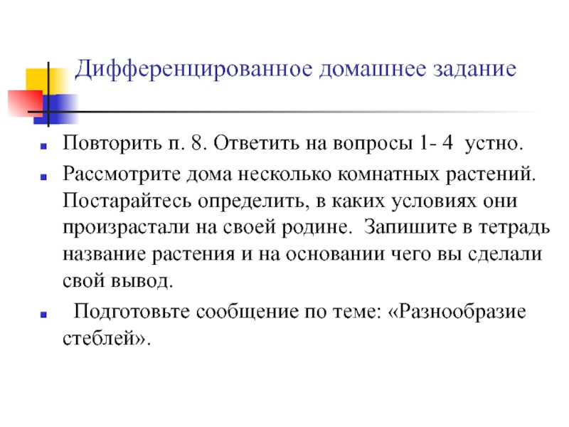 Дифференцированное домашнее заданиеПовторить п. 8. Ответить на вопросы 1- 4 устно.Рассмотрите дома несколько комнатных растений. Постарайтесь определить,