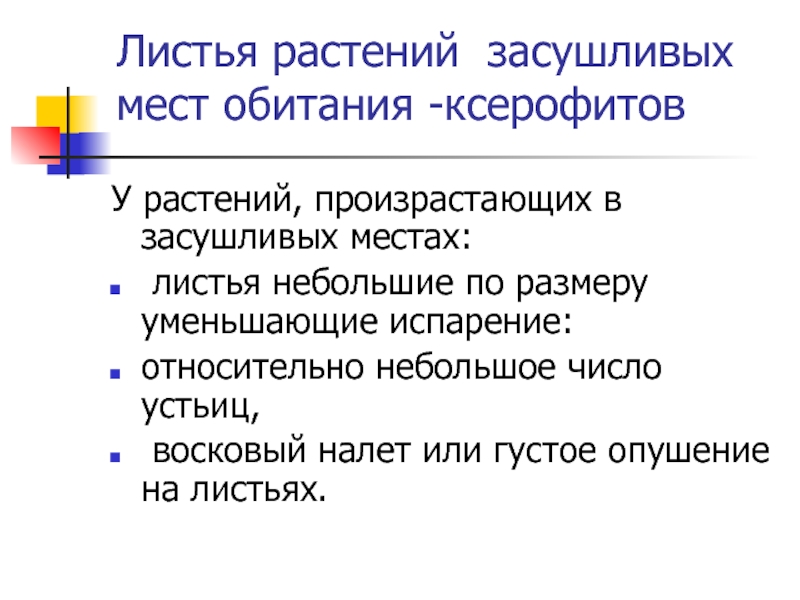 Листья растений засушливых мест обитания -ксерофитовУ растений, произрастающих в засушливых местах: листья небольшие по размеру уменьшающие испарение:
