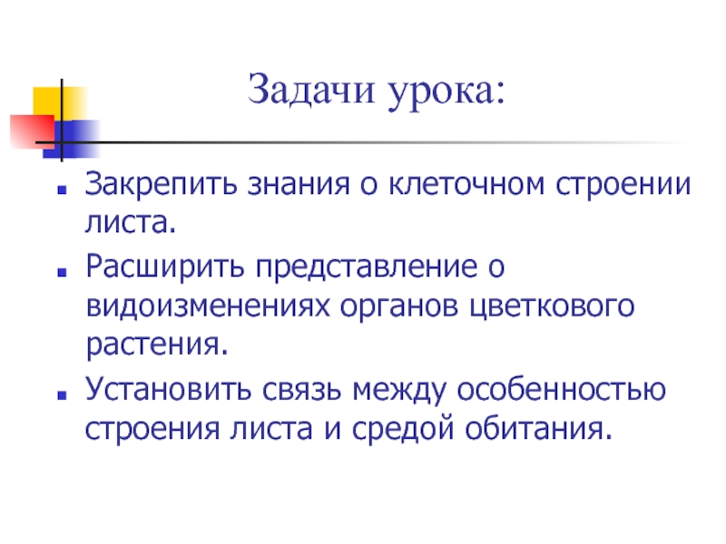 Задачи урока:Закрепить знания о клеточном строении листа.Расширить представление о видоизменениях органов цветкового растения.Установить связь между особенностью строения