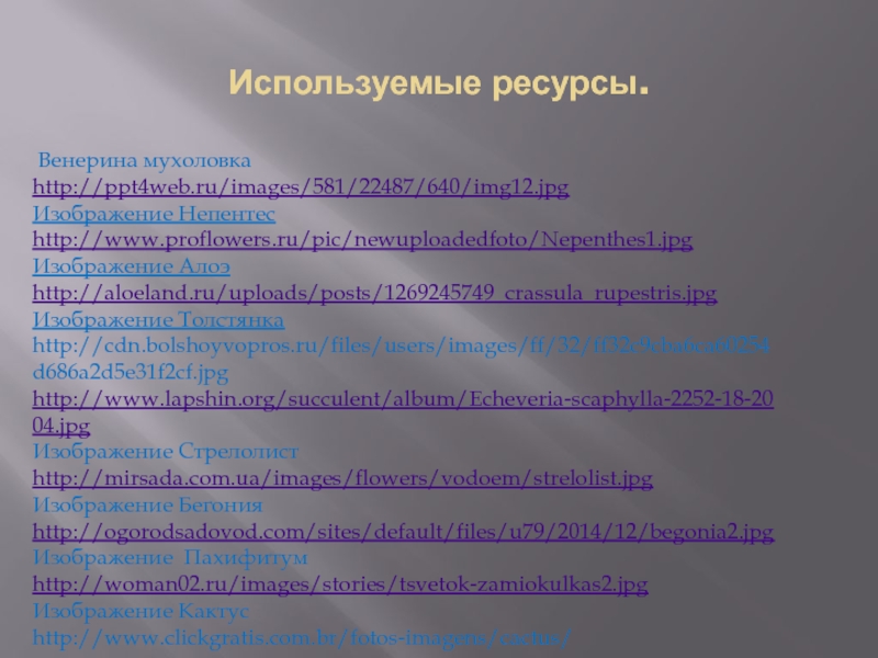 Венерина мухоловкаhttp://ppt4web.ru/images/581/22487/640/img12.jpgИзображение Непентесhttp://www.proflowers.ru/pic/newuploadedfoto/Nepenthes1.jpgИзображение Алоэhttp://aloeland.ru/uploads/posts/1269245749_crassula_rupestris.jpgИзображение Толстянкаhttp://cdn.bolshoyvopros.ru/files/users/images/ff/32/ff32c9cba6ca60254d686a2d5e31f2cf.jpghttp://www.lapshin.org/succulent/album/Echeveria-scaphylla-2252-18-2004.jpgИзображение Стрелолистhttp://mirsada.com.ua/images/flowers/vodoem/strelolist.jpgИзображение Бегонияhttp://ogorodsadovod.com/sites/default/files/u79/2014/12/begonia2.jpgИзображение Пахифитумhttp://woman02.ru/images/stories/tsvetok-zamiokulkas2.jpgИзображение Кактусhttp://www.clickgratis.com.br/fotos-imagens/cactus/Используемые ресурсы.