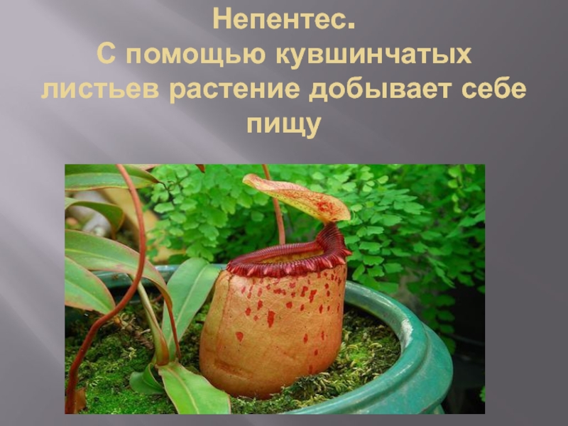 Слайд 11 Непентес. С помощью кувшинчатых листьев растение добывает себе пищу