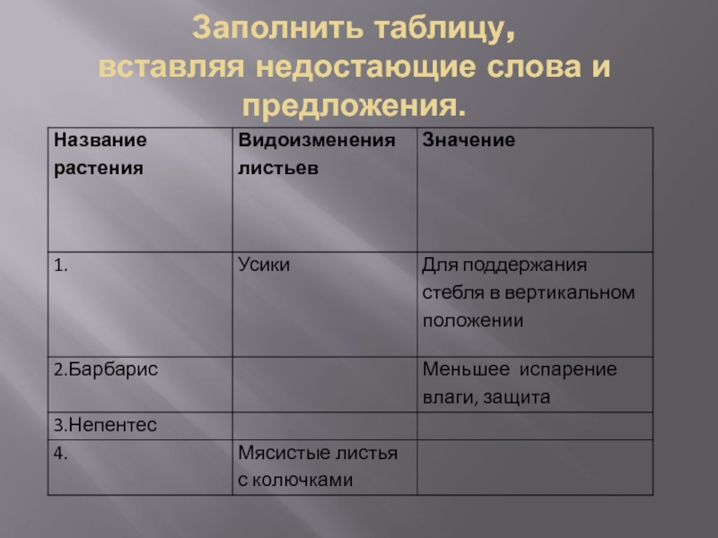 Заполнить таблицу,  вставляя недостающие слова и предложения.
