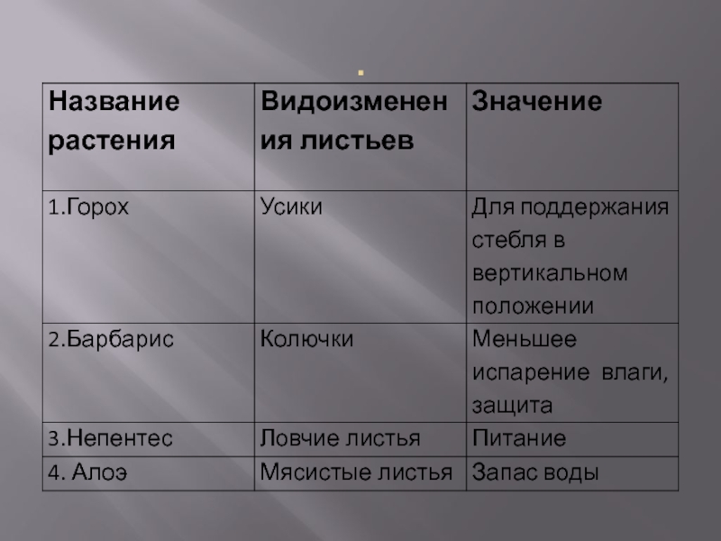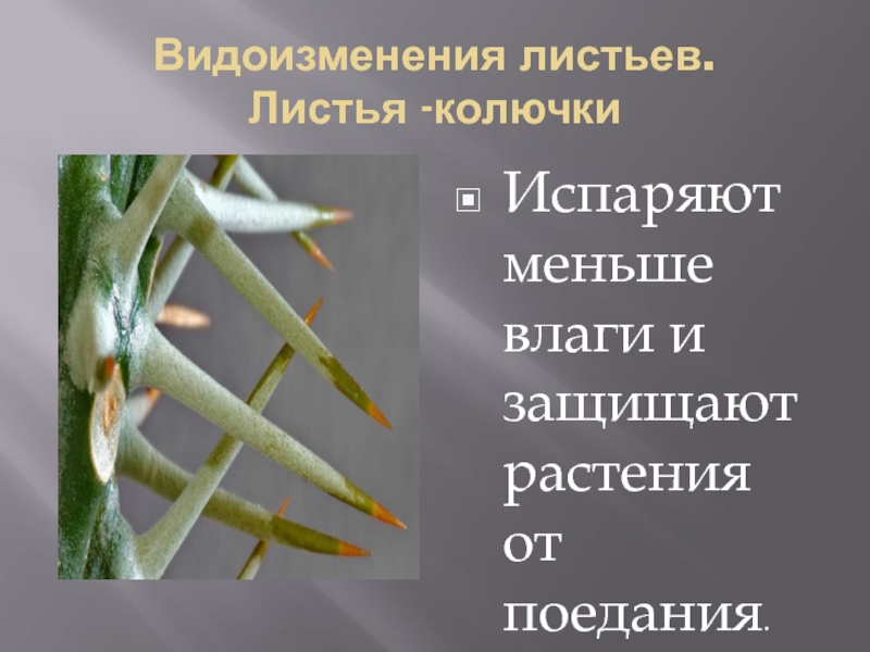 Видоизменения листьев. Листья -колючкиИспаряют меньше влаги и защищают растения от поедания.