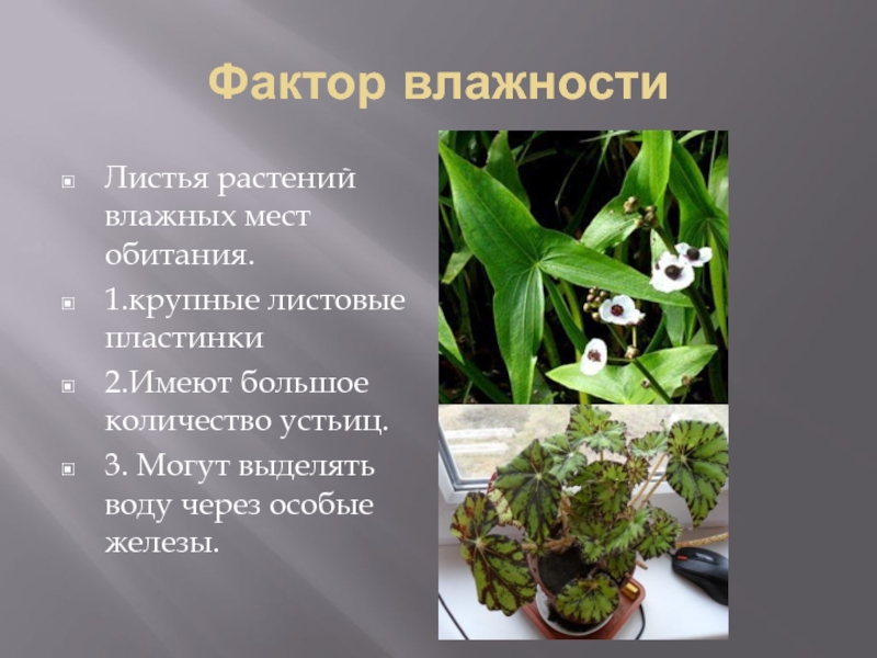 Фактор влажностиЛистья растений влажных мест обитания.1.крупные листовые пластинки2.Имеют большое количество устьиц.3. Могут выделять воду через особые железы.