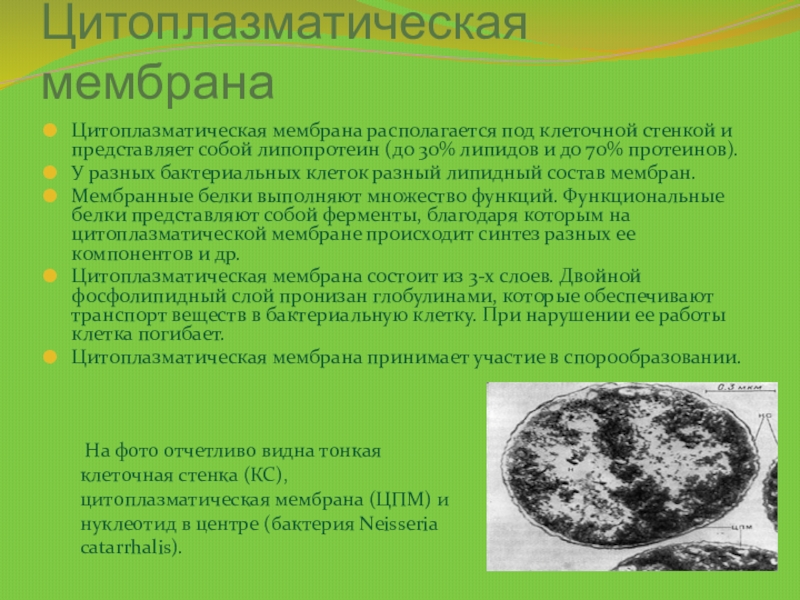 На фото отчетливо видна тонкая клеточная стенка (КС), цитоплазматическая мембрана (ЦПМ) и нуклеотид в центре (бактерия Neisseria catarrhalis).