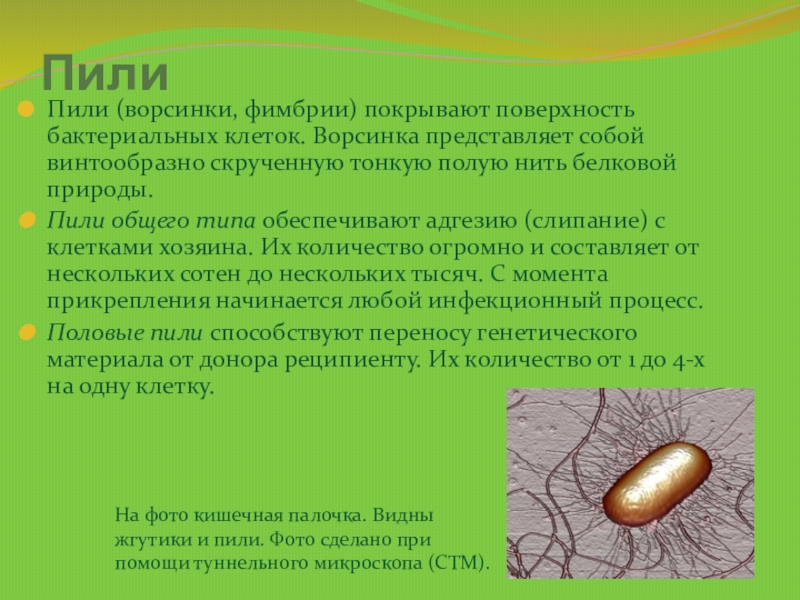 На фото кишечная палочка. Видны жгутики и пили. Фото сделано при помощи туннельного микроскопа (СТМ).