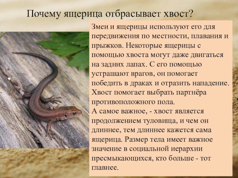 Почему ящерица отбрасывает хвост?Змеи и ящерицы используют его для передвижения по местности, плавания и прыжков. Некоторые ящерицы
