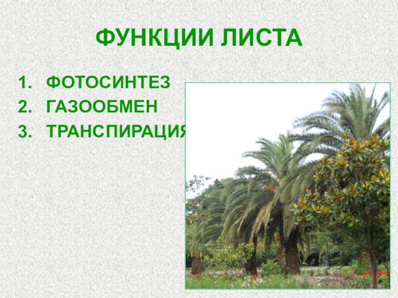 ФУНКЦИИ ЛИСТАФОТОСИНТЕЗГАЗООБМЕНТРАНСПИРАЦИЯ