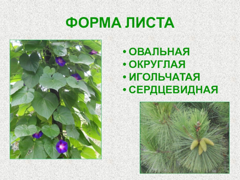 ФОРМА ЛИСТА ОВАЛЬНАЯ ОКРУГЛАЯ ИГОЛЬЧАТАЯ СЕРДЦЕВИДНАЯ