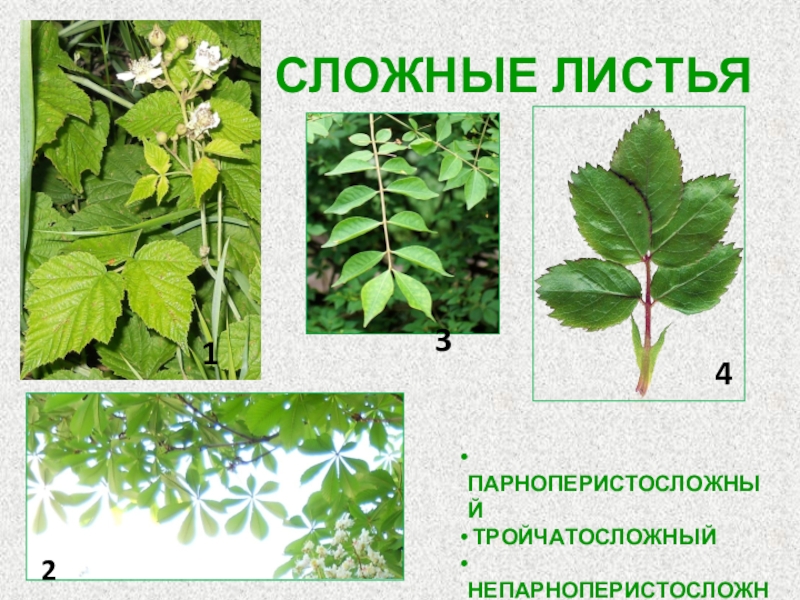 СЛОЖНЫЕ ЛИСТЬЯ ПАРНОПЕРИСТОСЛОЖНЫЙ ТРОЙЧАТОСЛОЖНЫЙ НЕПАРНОПЕРИСТОСЛОЖНЫЙ ПАЛЬЧАТОСЛОЖНЫЙ1234
