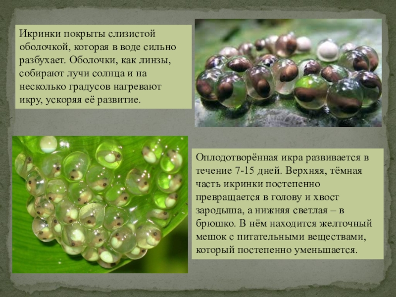 Оплодотворённая икра развивается в течение 7-15 дней. Верхняя, тёмная часть икринки постепенно превращается в голову и хвост зародыша, а нижняя светлая – в брюшко. В нём находится желточный мешок с питательными веществами, который постепенно уменьшается.