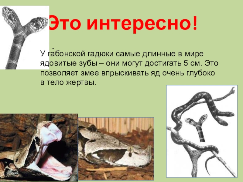 Это интересно!.У габонской гадюки самые длинные в мире ядовитые зубы – они могут достигать 5 см. Это