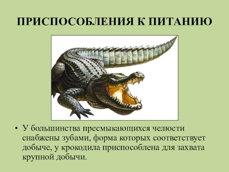 ПРИСПОСОБЛЕНИЯ К ПИТАНИЮУ большинства пресмыкающихся челюсти снабжены зубами, форма которых соответствует добыче, у крокодила приспособлена для захвата