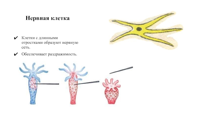 Нервная клеткаКлетки с длинными отростками образуют нервную сеть.Обеспечивает раздражимость.