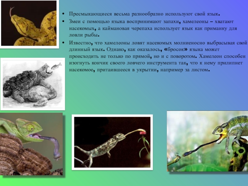 запахи, хамелеоны – хватают насекомых, а каймановая черепаха использует язык как приманку для ловли рыбы.