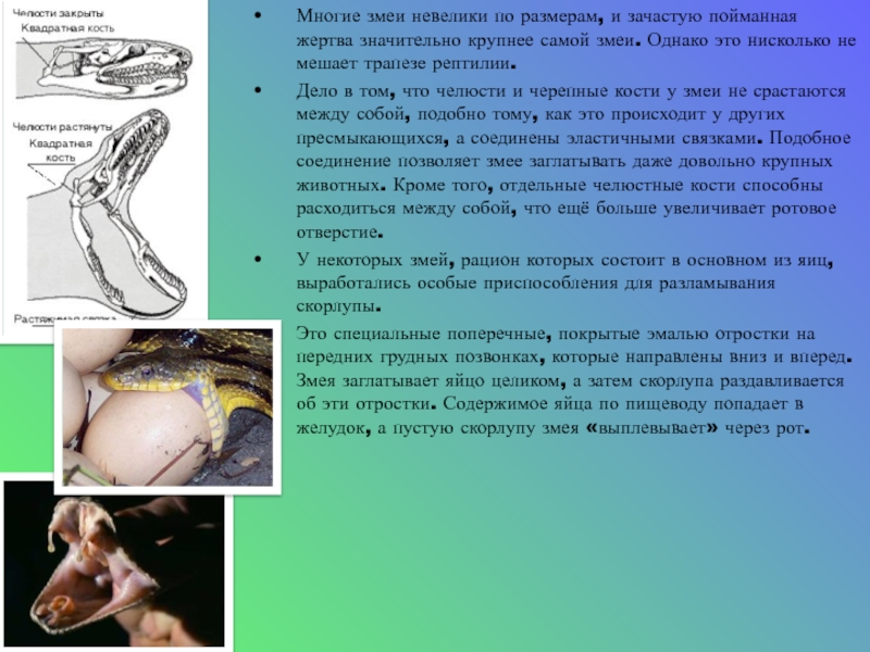 Слайд 5Многие змеи невелики по размерам, и зачастую пойманная жертва значительно крупнее