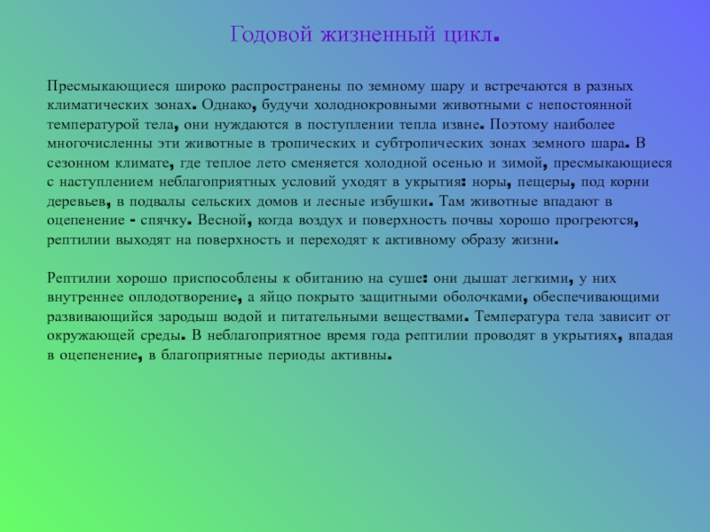 в разных климатических зонах. Однако, будучи холоднокровными животными с непостоянной температурой тела, они нуждаются в поступлении тепла извне. Поэтому наиболее многочисленны эти животные в тропических и субтропических зонах земного шара. В сезонном климате, где теплое лето сменяется холодной осенью и зимой, пресмыкающиеся с наступлением неблагоприятных условий уходят в укрытия: норы, пещеры, под корни деревьев, в подвалы сельских домов и лесные избушки. Там животные впадают в оцепенение - спячку. Весной, когда воздух и поверхность почвы хорошо прогреются, рептилии выходят на поверхность и переходят к активному образу жизни.