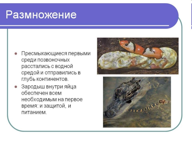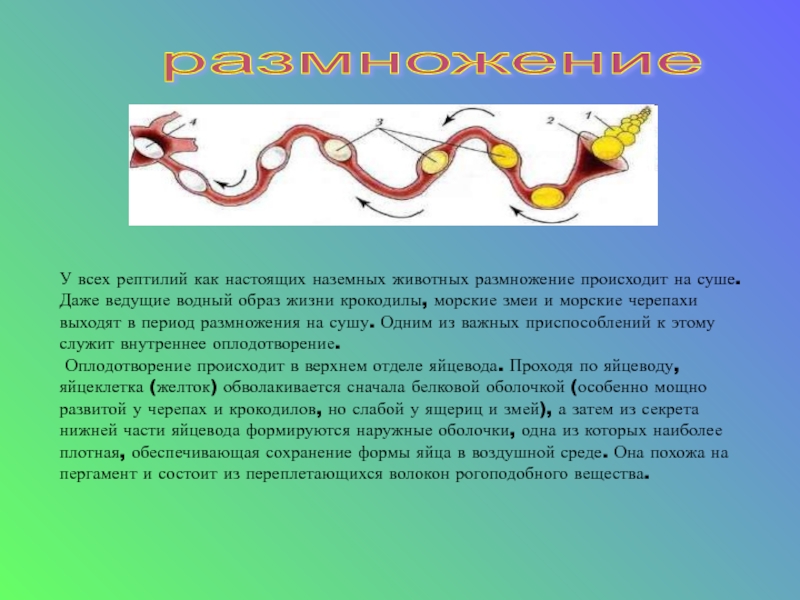 на суше. Даже ведущие водный образ жизни крокодилы, морские змеи и морские черепахи выходят в период размножения на сушу. Одним из важных приспособлений к этому служит внутреннее оплодотворение.