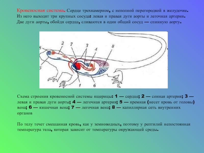 Схема строения кровеносной системы ящерицы: 1 — сердце; 2 — сонная артерия; 3 — левая и правая дуги аорты; 4 — легочная артерия; 5 — яремная (несет кровь от головы) вена; 6 — кишечная вена; 7 — легочная вена; 8 — капиллярная сеть внутренних органов