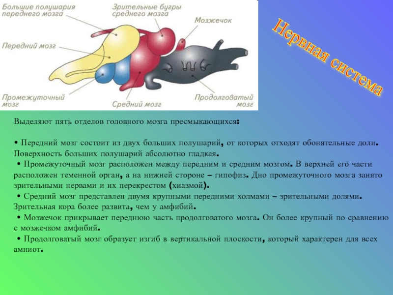 Слайд 8Выделяют пять отделов головного мозга пресмыкающихся: