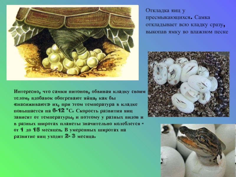 Слайд 13Откладка яиц у пресмыкающихся. Самка откладывает всю кладку сразу, выкопав ямку