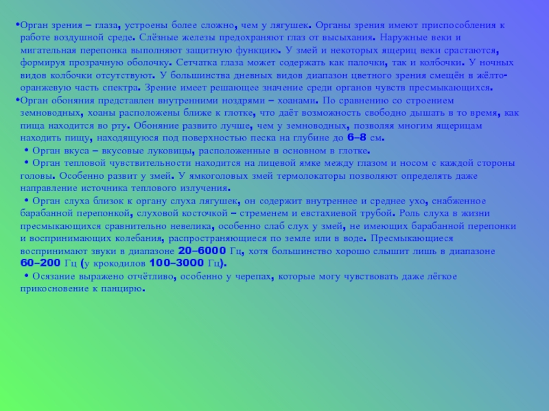 зрения имеют приспособления к работе воздушной среде. Слёзные железы предохраняют глаз от высыхания. Наружные веки и мигательная перепонка выполняют защитную функцию. У змей и некоторых ящериц веки срастаются, формируя прозрачную оболочку. Сетчатка глаза может содержать как палочки, так и колбочки. У ночных видов колбочки отсутствуют. У большинства дневных видов диапазон цветного зрения смещён в жёлто-оранжевую часть спектра. Зрение имеет решающее значение среди органов чувств пресмыкающихся.