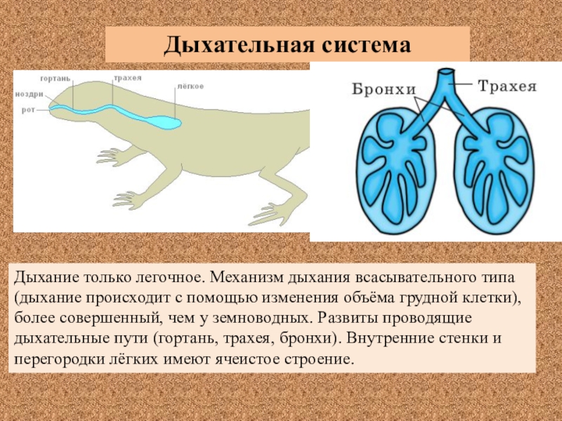 помощью изменения объёма грудной клетки), более совершенный, чем у земноводных. Развиты проводящие дыхательные пути (гортань, трахея, бронхи). Внутренние стенки и перегородки лёгких имеют ячеистое строение.