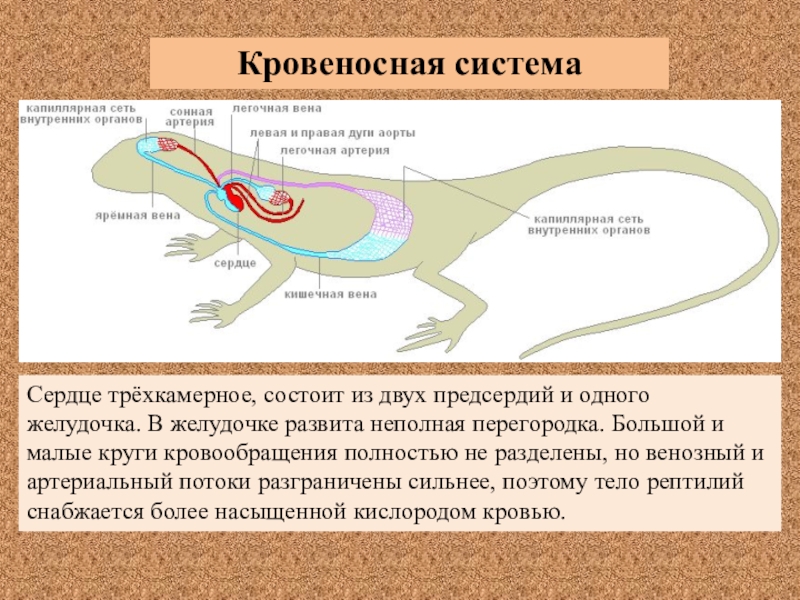желудочке развита неполная перегородка. Большой и малые круги кровообращения полностью не разделены, но венозный и артериальный потоки разграничены сильнее, поэтому тело рептилий снабжается более насыщенной кислородом кровью.