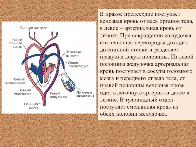 левое – артериальная кровь от лёгких. При сокращении желудочка его неполная перегородка доходит до спинной стенки и разделяет правую и левую половины. Из левой половины желудочка артериальная кровь поступает в сосуды головного мозга и переднего отдела тела, от правой половины венозная кровь идёт в легочную артерию и далее в лёгкие. В туловищный отдел поступает смешанная кровь из обеих половин желудочка.