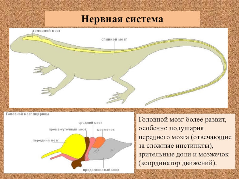 Нервная системаГоловной мозг более развит, особенно полушария переднего мозга (отвечающие за сложные инстинкты), зрительные доли и мозжечок