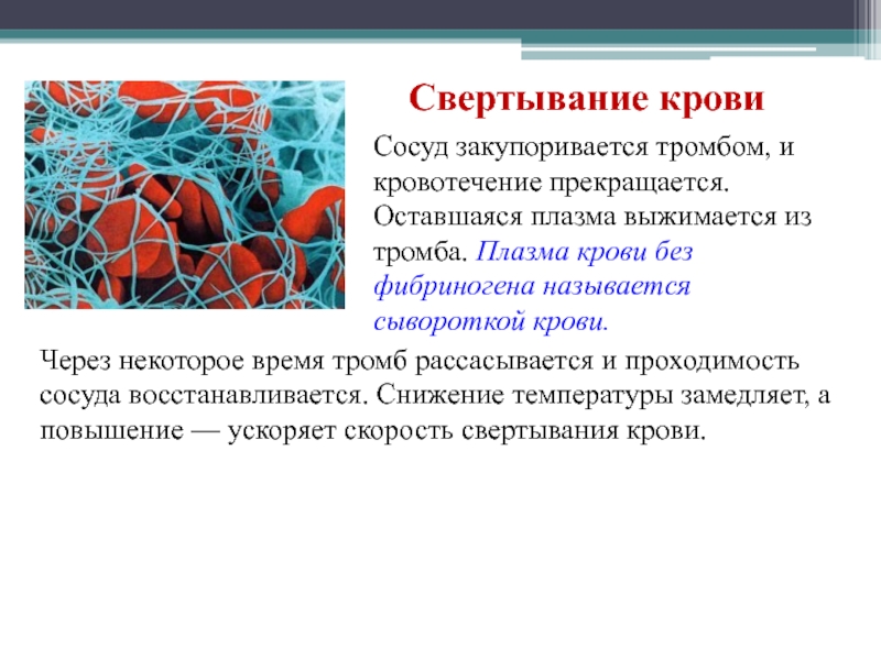 Сосуд закупоривается тромбом, и кровотечение прекращается. Оставшаяся плазма выжимается из тромба. Плазма крови без фибриногена называется сывороткой крови.