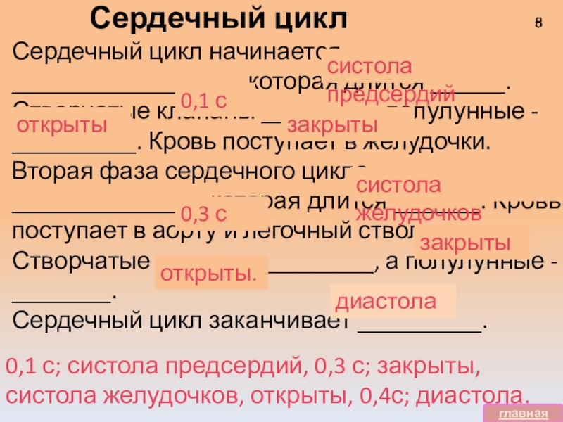 0,1 с; систола предсердий, 0,3 с; закрыты, систола желудочков, открыты, 0,4с; диастола.