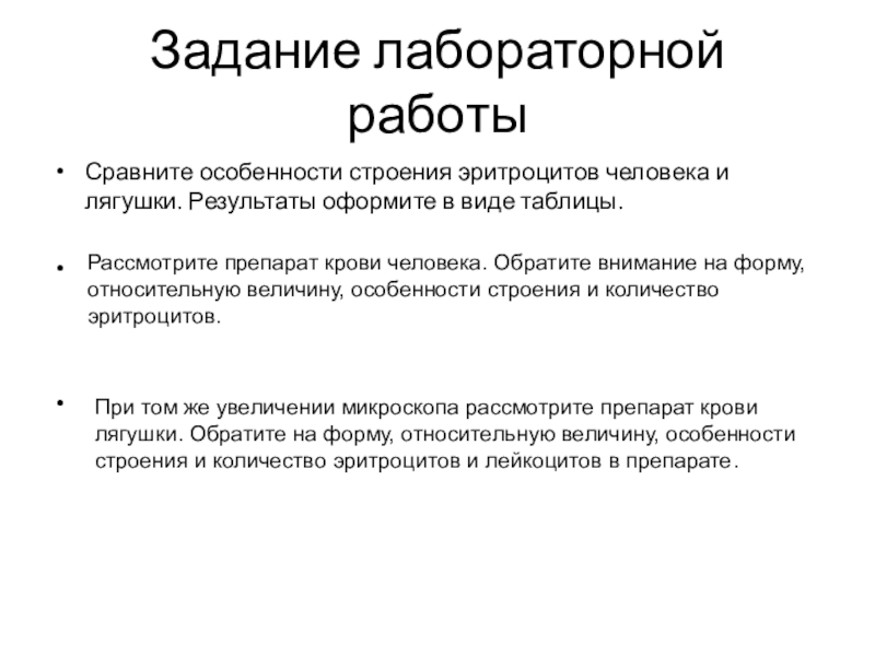 При том же увеличении микроскопа рассмотрите препарат крови лягушки. Обратите на форму, относительную величину, особенности строения и количество эритроцитов и лейкоцитов в препарате.
