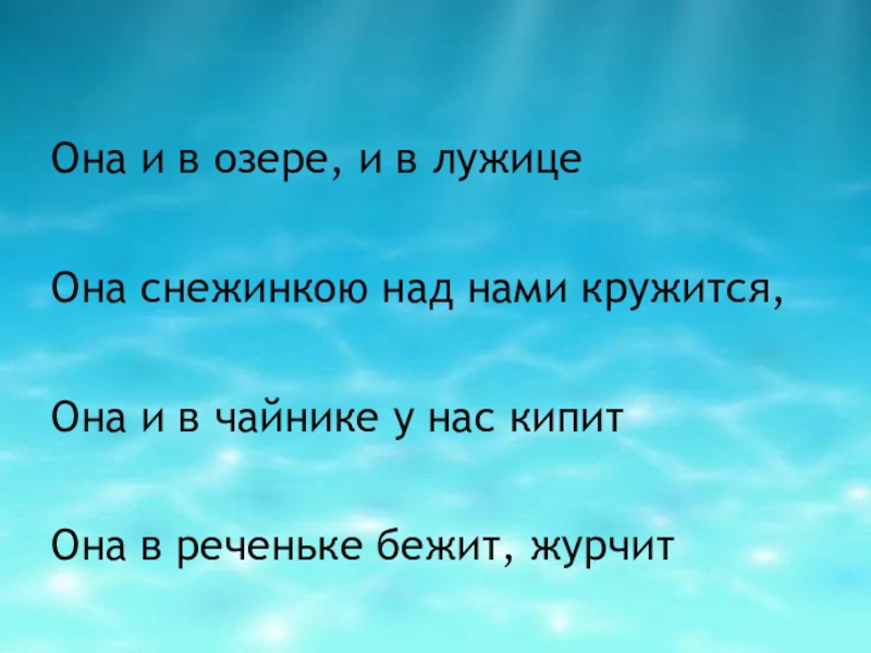 Она и в озере, и в лужице	Она снежинкою над нами кружится,	Она и в чайнике у нас кипит	Она
