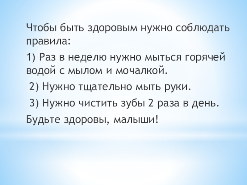 Чтобы быть здоровым нужно соблюдать правила:1) Раз в неделю нужно мыться горячей водой с мылом и мочалкой.