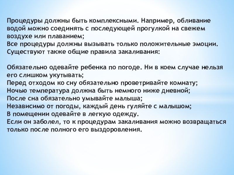 Слайд 11 Процедуры должны быть комплексными. Например, обливание водой можно соединять с последующей