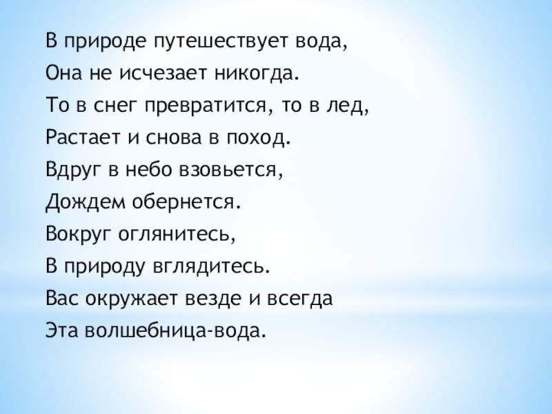 В природе путешествует вода,Она не исчезает никогда.То в снег превратится, то в лед,Растает и снова в поход.
