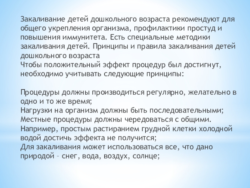 Слайд 10Закаливание детей дошкольного возраста рекомендуют для общего укрепления организма, профилактики простуд