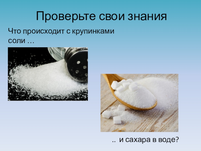 Проверьте свои знанияЧто происходит с крупинками соли ….. и сахара в воде?