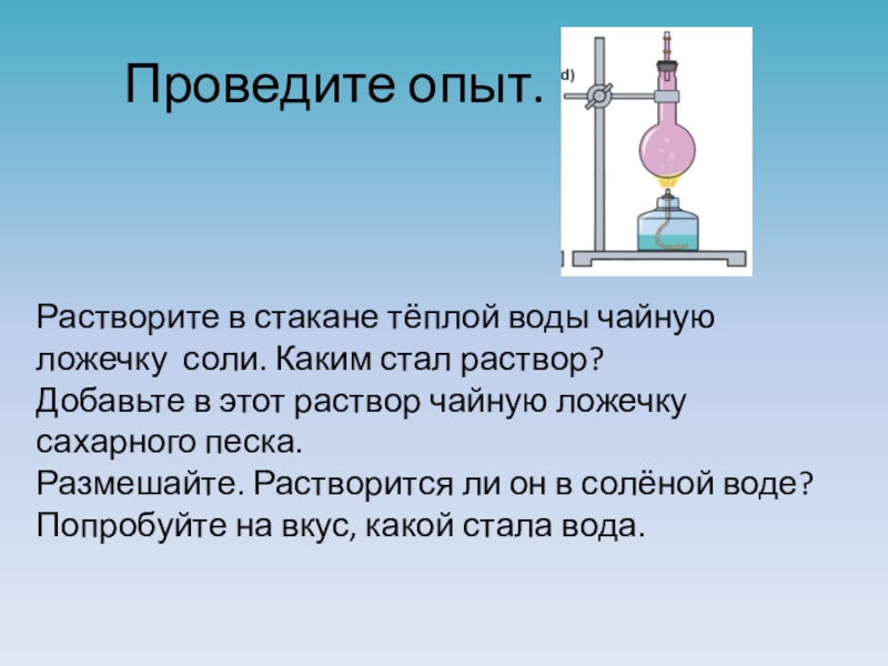 Проведите опыт.Растворите в стакане тёплой воды чайную ложечку соли. Каким стал раствор?Добавьте в этот раствор чайную ложечку