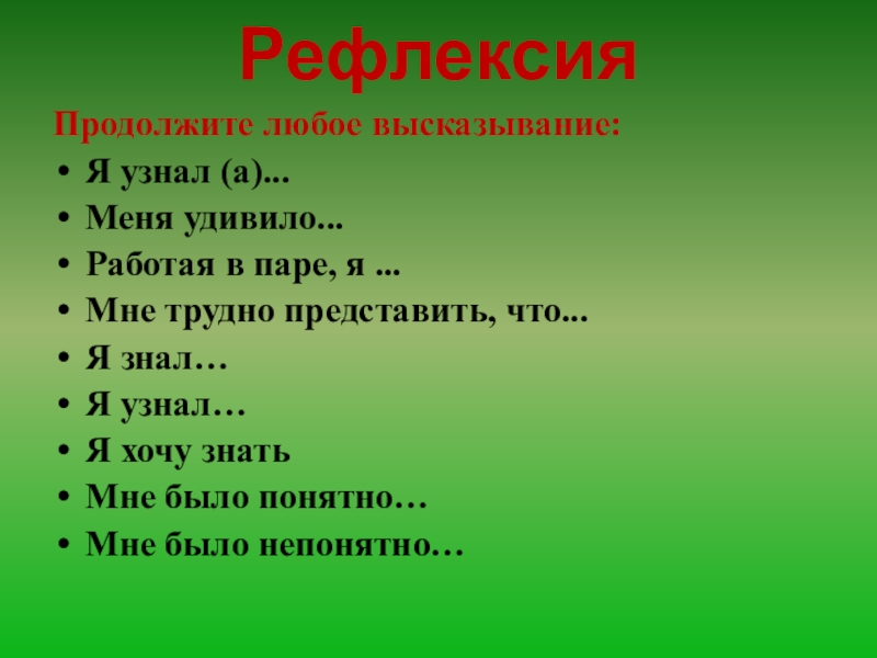 Рефлексия Продолжите любое высказывание: Я узнал (а)...Меня удивило...Работая в паре, я ...Мне трудно представить, что...Я знал…Я узнал…Я