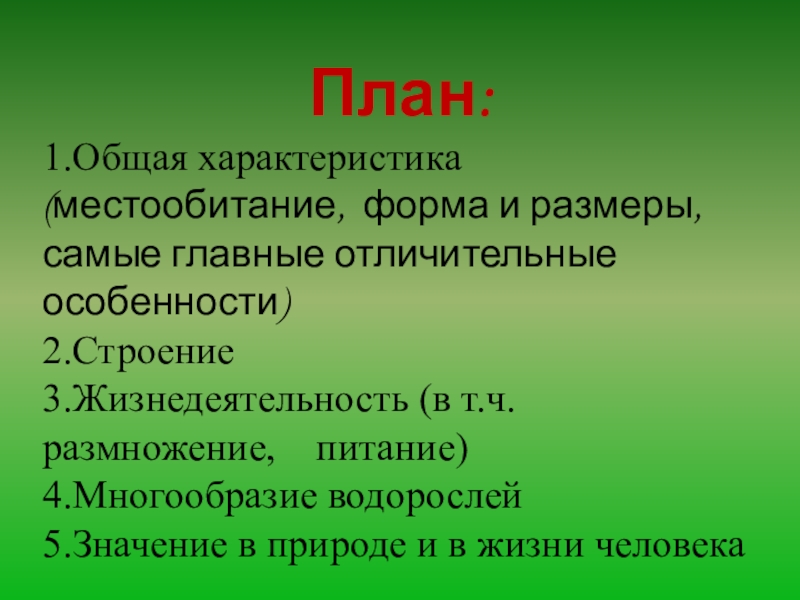 План: 1.Общая характеристика (местообитание, форма и размеры, самые главные отличительные особенности) 2.Строение3.Жизнедеятельность (в т.ч. размножение, питание) 4.Многообразие водорослей5.Значение в природе и в жизни человека