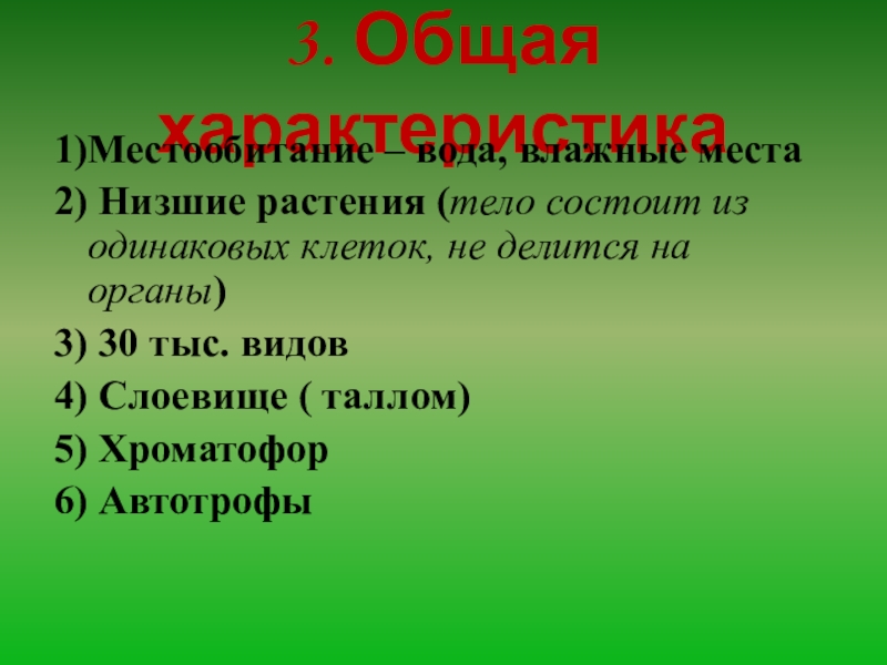 3. Общая характеристика1)Местообитание – вода, влажные места2) Низшие растения (тело состоит из одинаковых клеток, не делится на