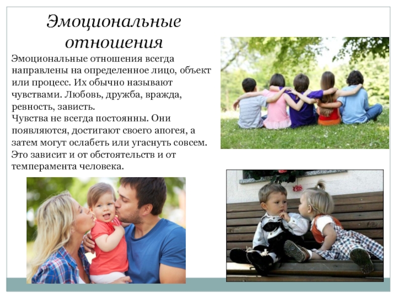 Эмоциональные отношенияЭмоциональные отношения всегда направлены на определенное лицо, объект или процесс. Их обычно называют чувствами. Любовь, дружба,