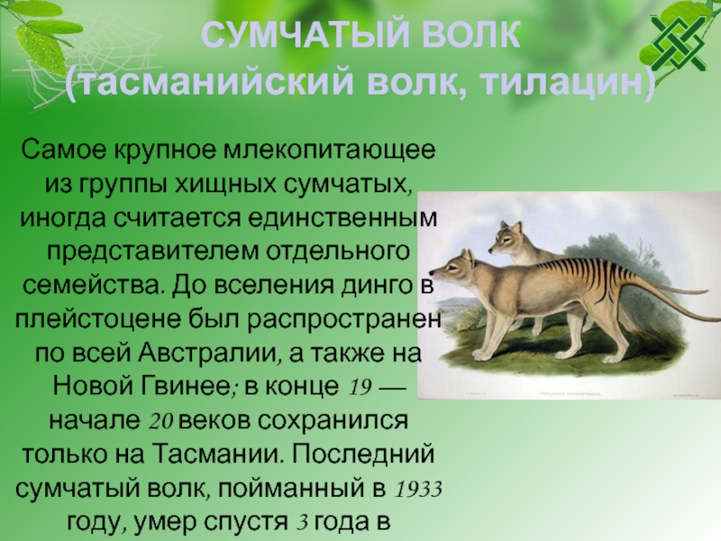сумчатых, иногда считается единственным представителем отдельного семейства. До вселения динго в плейстоцене был распространен по всей Австралии, а также на Новой Гвинее; в конце 19 — начале 20 веков сохранился только на Тасмании. Последний сумчатый волк, пойманный в 1933 году, умер спустя 3 года в зоопарке г. Хобарт (Тасмания).